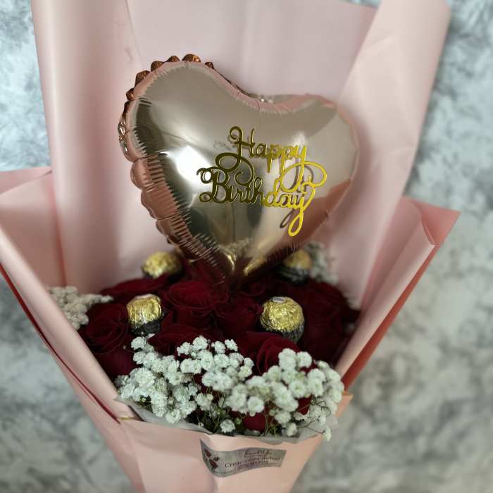 Price: $94.00Bouquet of 12 red roses with Ferrero chocolates and a balloon for all occasions. Rose bouquet